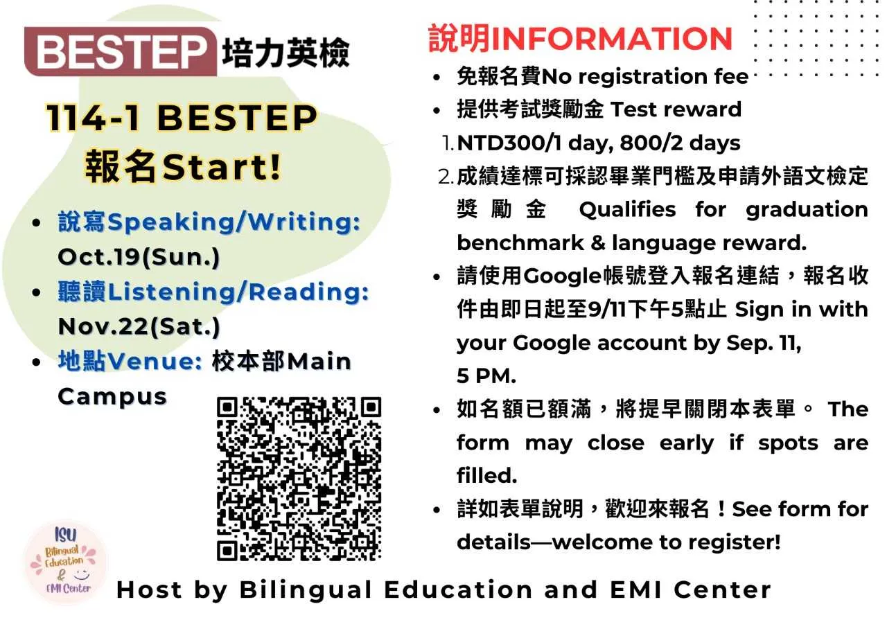 I-Shou University, approved by the Ministry of Education for the BEST Project, offers fee subsidies for the BESTEP test. Students can take all four sections—listening, speaking, reading, and writing—free of charge. Limited seats available, so sign up early!