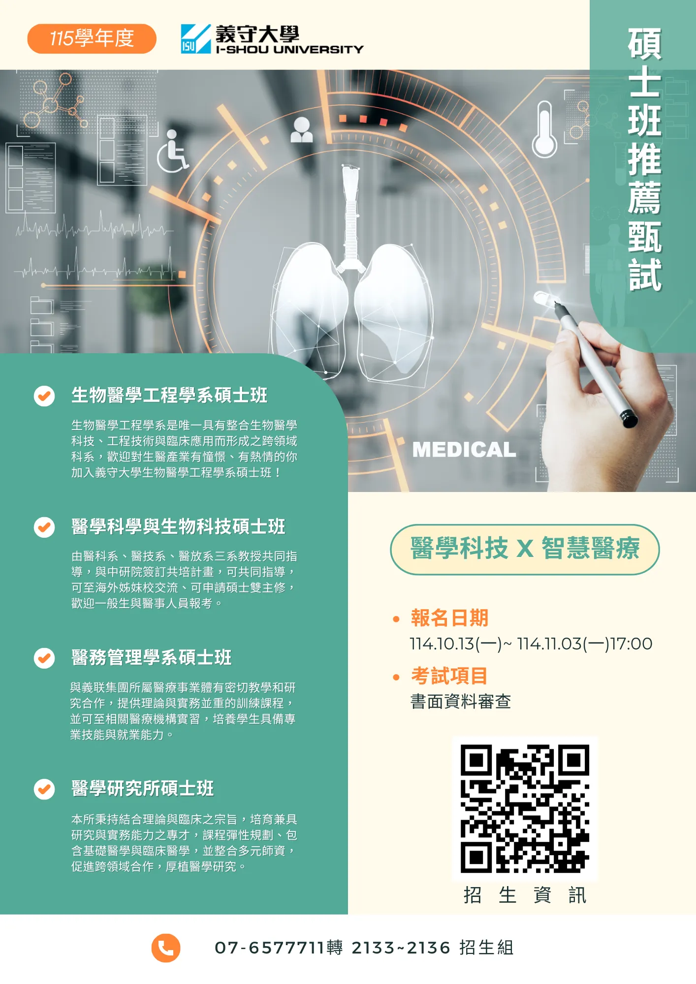 115學年度博碩士班推薦甄試訊息-醫學◎科技 聯合招生
