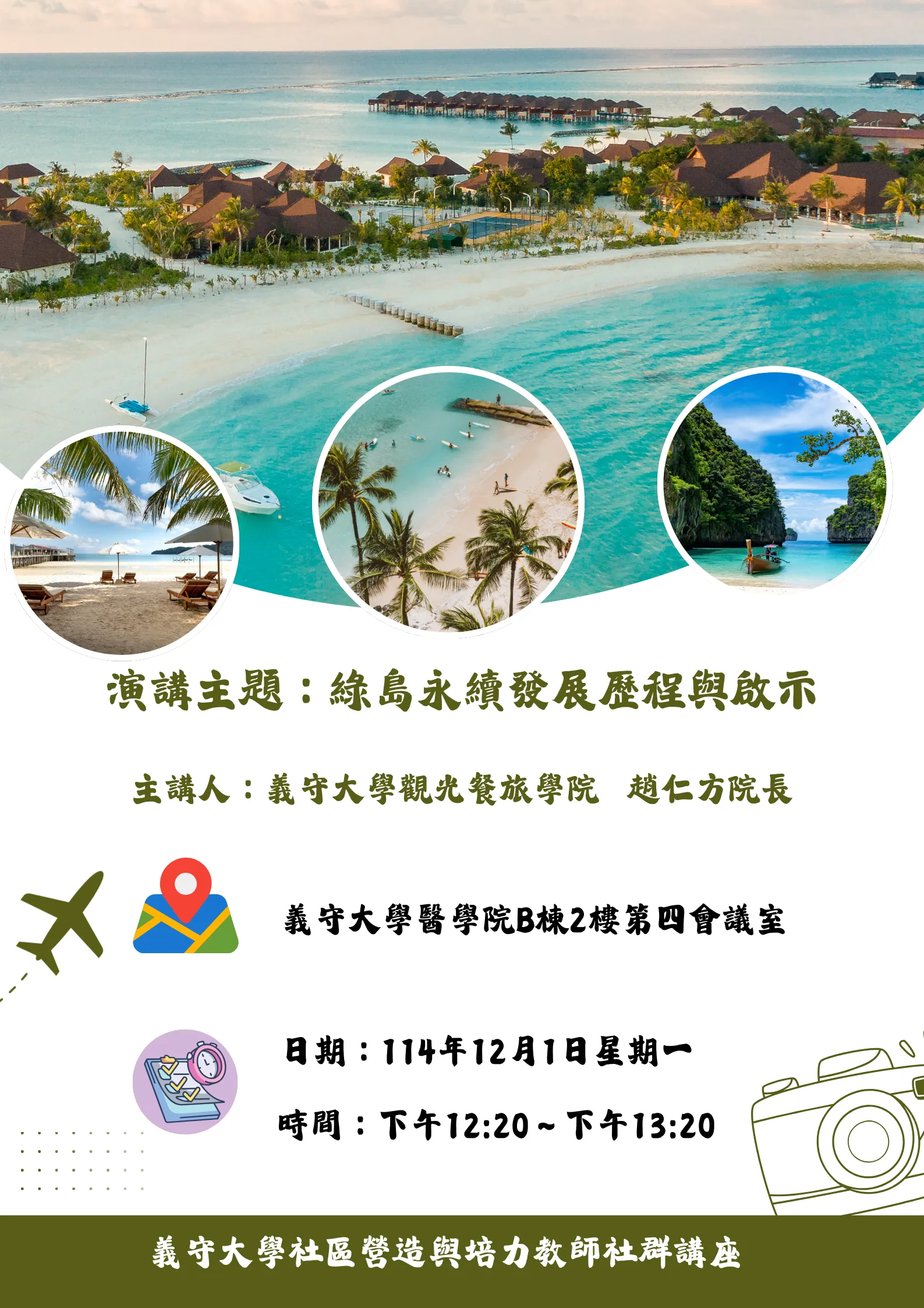 本次邀請 義守大學觀光餐旅學院 趙仁方院長,帶大家走進綠島的永續歷程,從觀光、社區到教育,一次揭開小島如何激發大行動的故事!