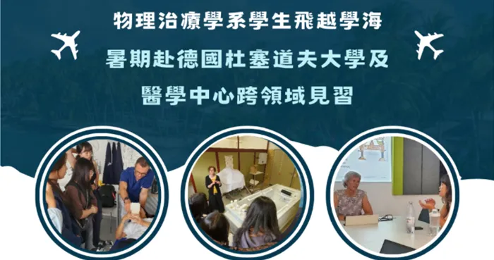 物理治療學系共選送5位同學,飛行逾9000公里前往德國杜塞道夫大學(Heinrich Heine Universität Düsseldorf, HHU D)及該校醫學中心(Universitätsklinikum Düsseldorf, UKD),與德國醫學人文教育教授及物理治療臨床工作專家們進行跨領域交流學習。物理治療學系共選送5位學子,飛行逾9000公里前往德國杜塞道夫大學(Heinrich Heine Universität Düsseldorf, HHU D)及該校醫學中心(Universitätsklinikum Düsseldorf, UKD),與德國醫學人文教育教授及物理治療臨床工作專家們進行跨領域交流學習